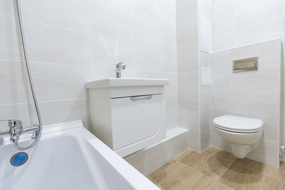 В ванной комнате и туалете выполнена кафельная отделка стен до потолка. На полу – керамогранит. Установлена вся необходимая сантехника. Коммуникации скрыты коробом, облицованным плиткой. Вам останется только подключить стиральную машину.